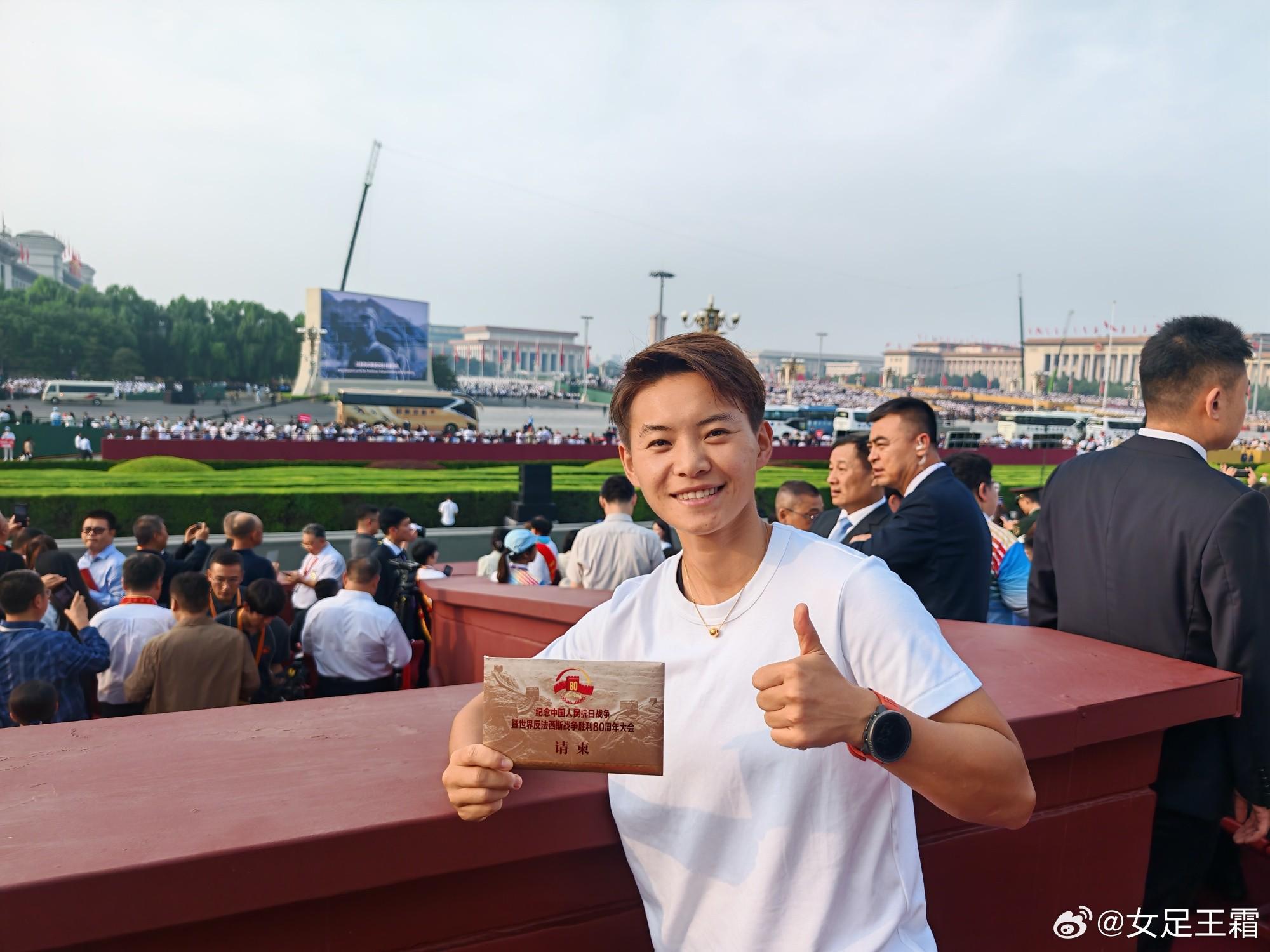 9月3日,中国女足球员王霜在社交媒体上晒出自己现场观看抗战胜利80周年阅兵式的照片。